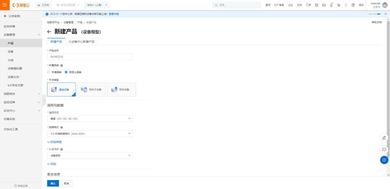 3、產(chǎn)品名稱自定義,聯(lián)網(wǎng)方式選設(shè)備真實(shí)聯(lián)網(wǎng)方式,其他按圖設(shè)置后確認(rèn)