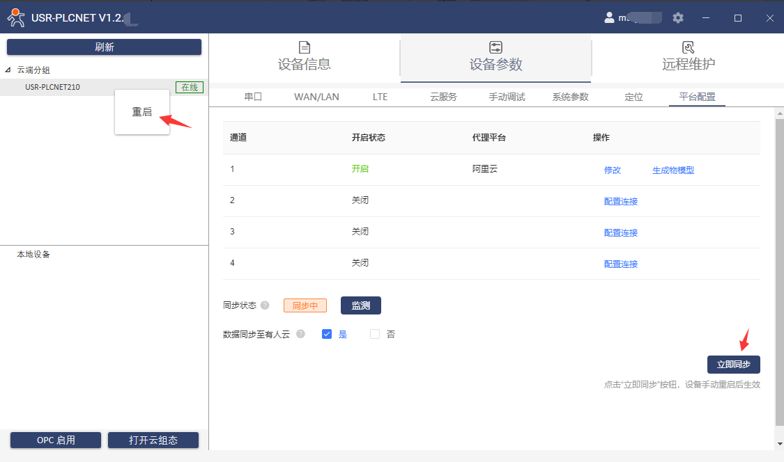 (下發(fā)后,阿里云平臺設(shè)備處不會(huì)立即更新數(shù)據(jù),需要等到plcnet上報(bào)周期時(shí)間到,上報(bào)數(shù)據(jù)后更新)