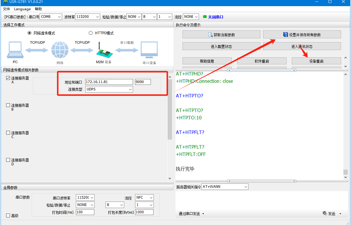 (5)勾選鏈接服務(wù)器A,填寫PC的IP和監(jiān)聽端口,鏈接類型選擇UDPC,即UDC Client。設(shè)置完參數(shù)點擊“設(shè)置并保存所有參數(shù)”,執(zhí)行完畢后,點擊軟件重啟,待串口打印啟動信息,如“USR-G781”,代表設(shè)備重啟完畢。