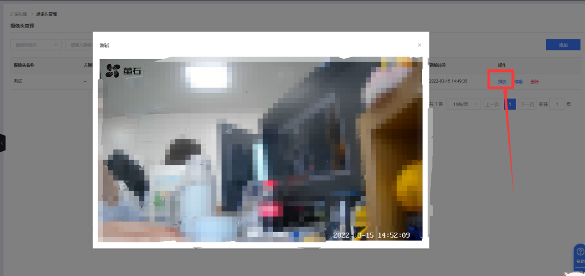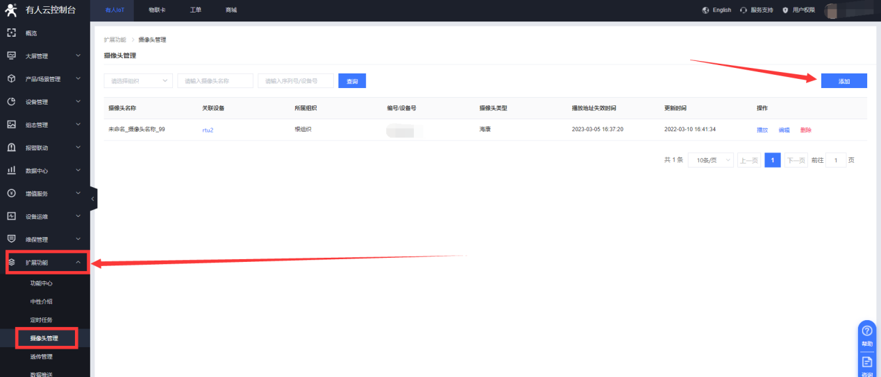 (1)登陸有人云平臺后在左側(cè) 擴展功能-功能中心 中開通《攝像頭管理》功能,便可在下拉列表中找到該功能,點擊并選擇添加一個攝像頭