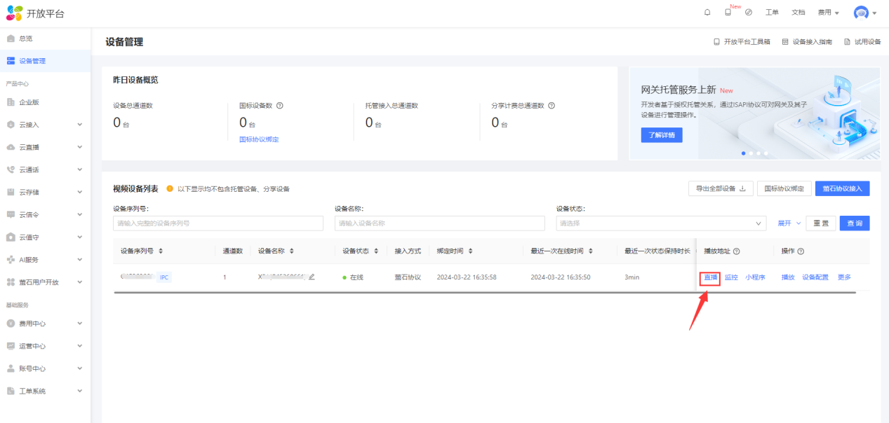 (5)點擊設(shè)備后的 直播地址 獲取到播放地址URL