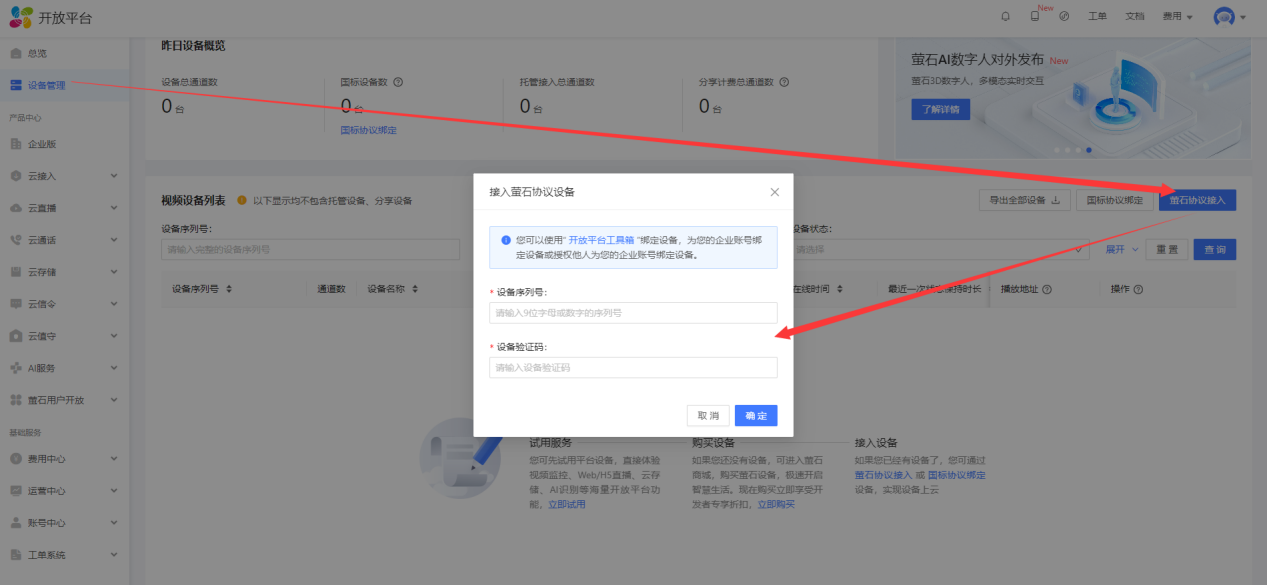 (2)在彈出的對話框中寫入攝像頭標(biāo)簽上的序列號與驗證碼,點確定