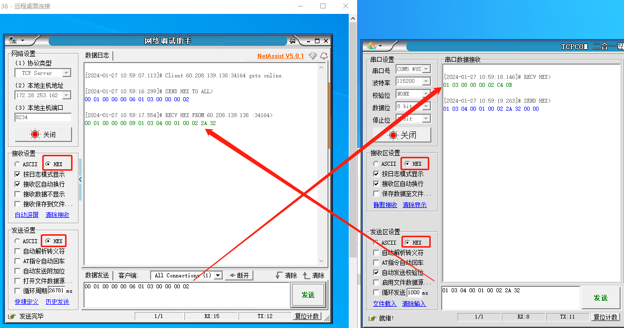 服務(wù)器與串口助手均勾選HEX按16進制發(fā)送以及接收。