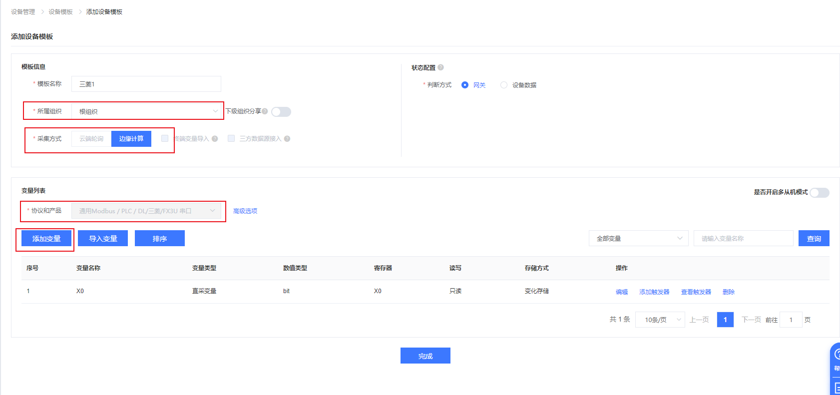 3、與網(wǎng)關(guān)一致的組織,采集方式:邊緣計(jì)算,選擇對(duì)應(yīng)型號(hào)的串口協(xié)議,添加需要采集的變量點(diǎn)