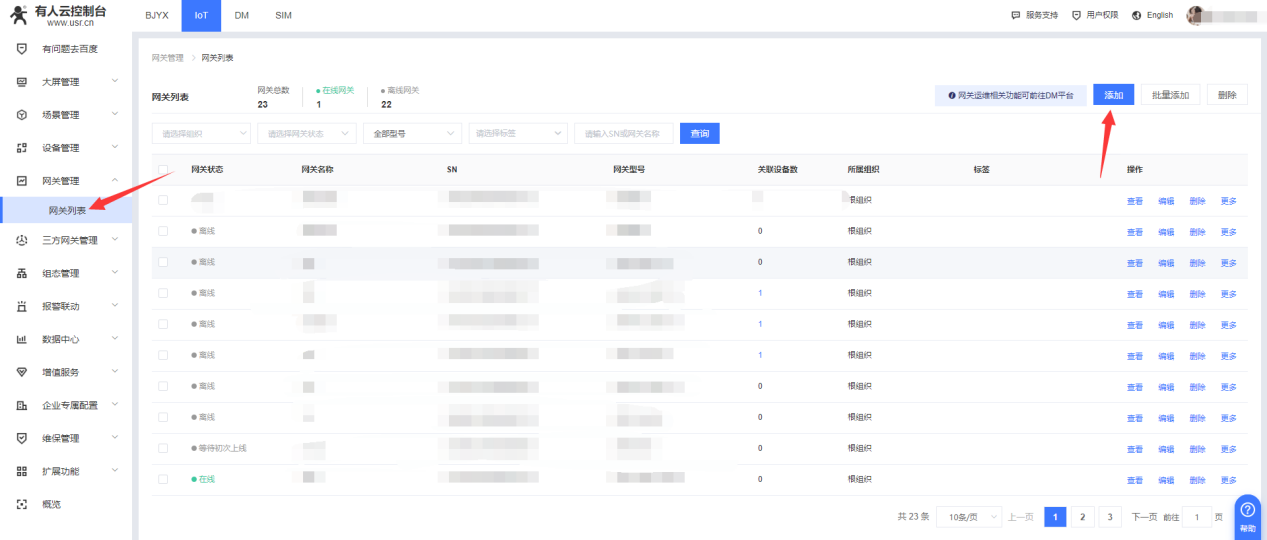 1、將網(wǎng)關(guān)添加到有人云平臺(tái):在網(wǎng)關(guān)列表點(diǎn)擊添加