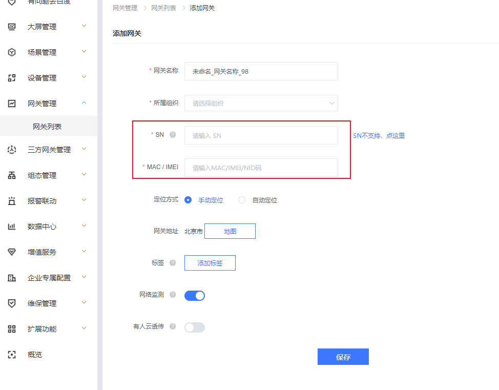 輸入網(wǎng)關(guān)sn、mac,其他配置自定義,保存后等待一會(huì)網(wǎng)關(guān)駐網(wǎng)上線