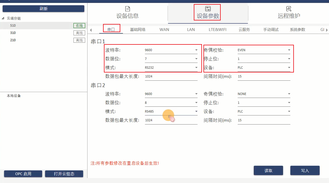 6、打開plcnet軟件配置網(wǎng)關(guān)參數(shù)(網(wǎng)關(guān)在線狀態(tài)才能遠(yuǎn)程配置),在對(duì)應(yīng)連接的com口進(jìn)行參數(shù)配置,模式根據(jù)上面使用的轉(zhuǎn)接線進(jìn)行選擇,三菱圓口串口參數(shù)默認(rèn)9600,E,7,1,如果修改過(guò)使用修改后的參數(shù),配置完成后寫入?yún)?shù),并重啟網(wǎng)關(guān)(右擊網(wǎng)關(guān)名稱可快捷重啟)
