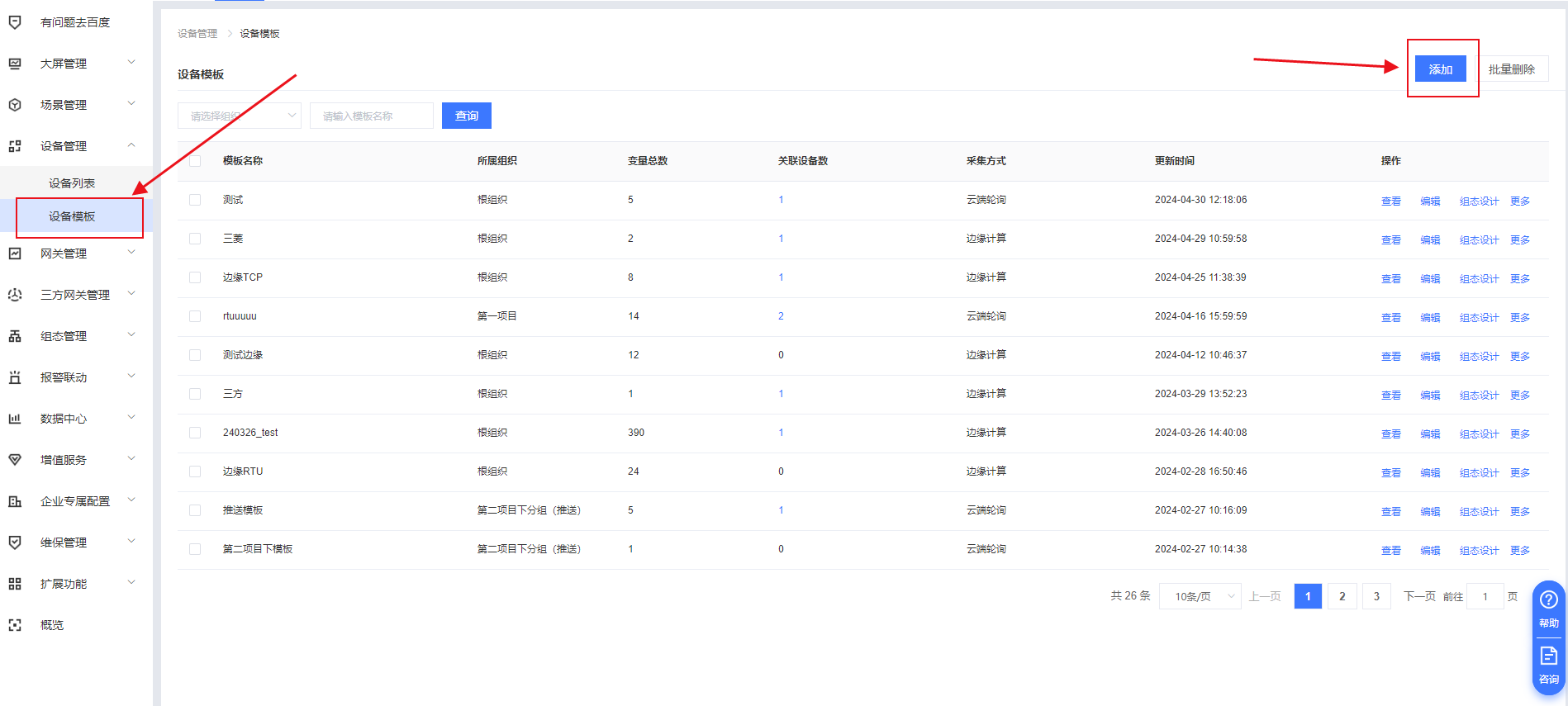 2、添加模板:在設(shè)備管理-設(shè)備模板內(nèi)添加