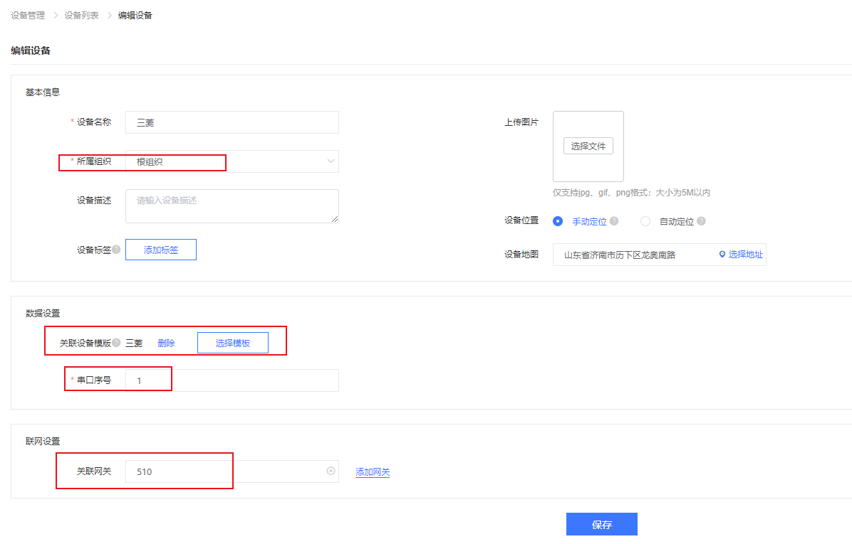 5、選擇一致的組織,綁定已添加的模板,串口序號(hào)根據(jù)實(shí)際安裝在plcnet網(wǎng)關(guān)上的com號(hào)來(lái)配置,關(guān)聯(lián)網(wǎng)關(guān)