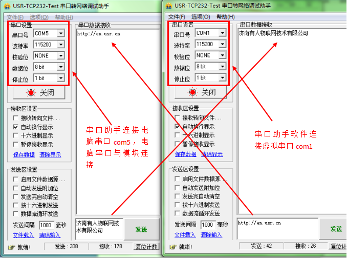 打開兩個(gè)串口調(diào)試助手軟件,一個(gè)連接電腦串口com5,一個(gè)連接虛擬串口com1.實(shí)現(xiàn)兩個(gè)串口直接數(shù)據(jù)互發(fā)。