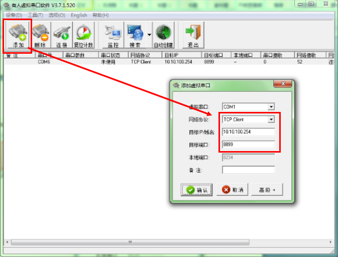添加虛擬串口com1:連接模塊的IP和端口:10.10.100.254:8899
