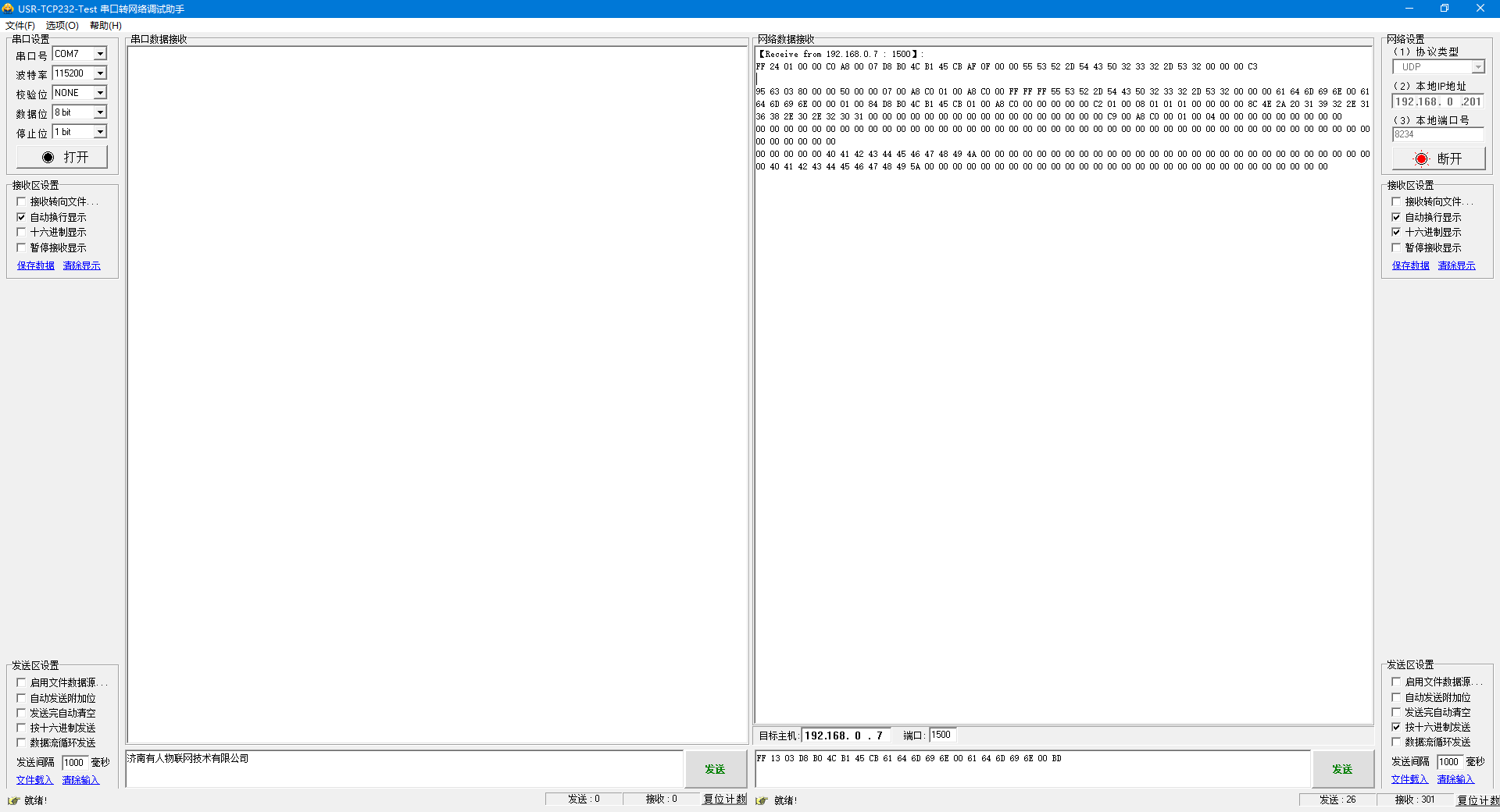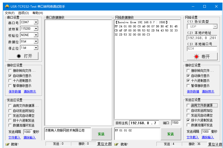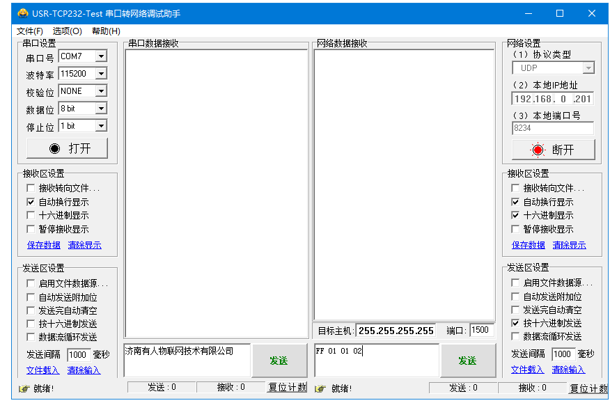 2、網(wǎng)絡(luò)端勾選按十六進(jìn)制發(fā)送,輸入搜索指令,F(xiàn)F 01 01 02