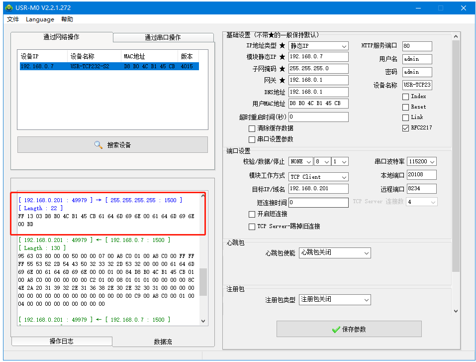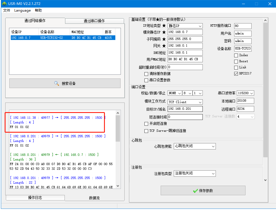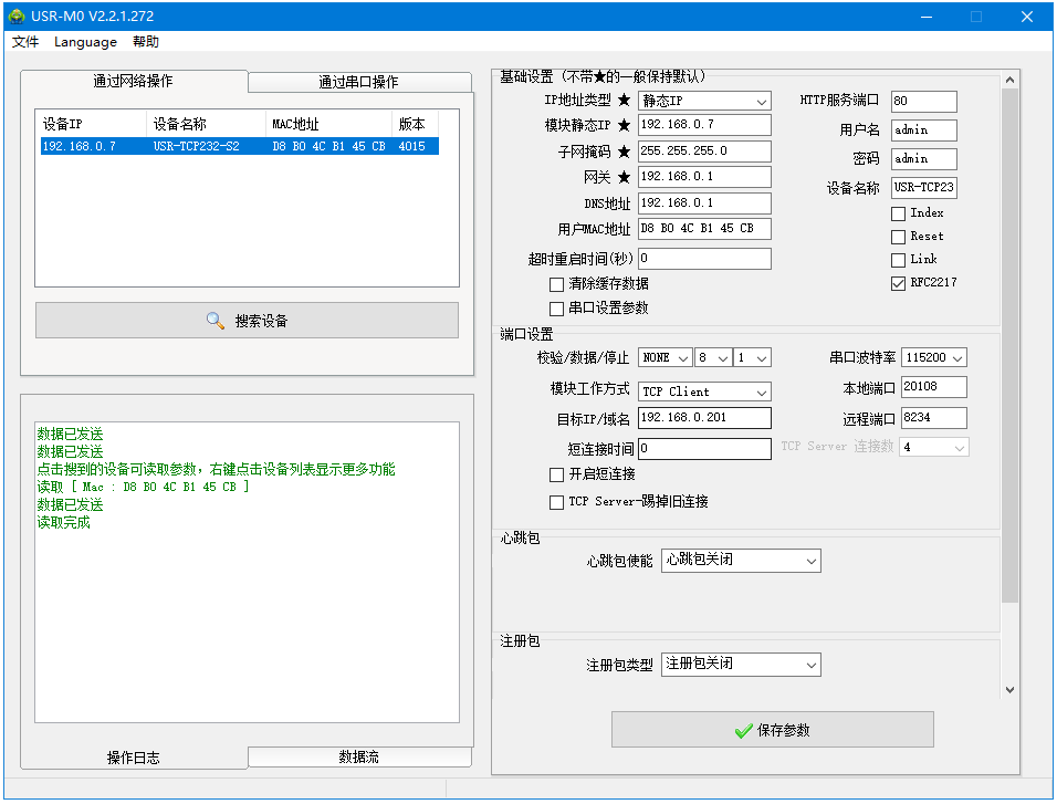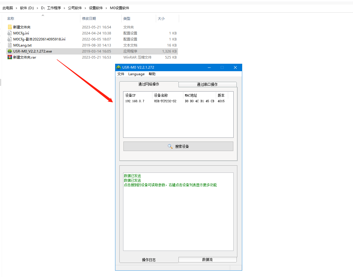 USR-TCP232-S2和電腦網(wǎng)線直連,打開M0軟件,搜到USR-TCP232-S2的IP。