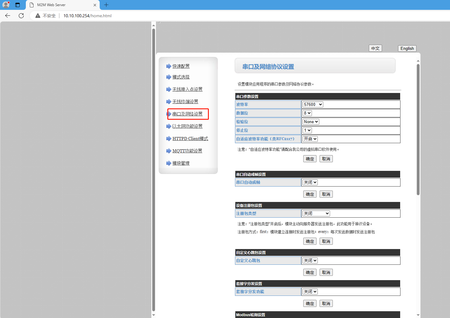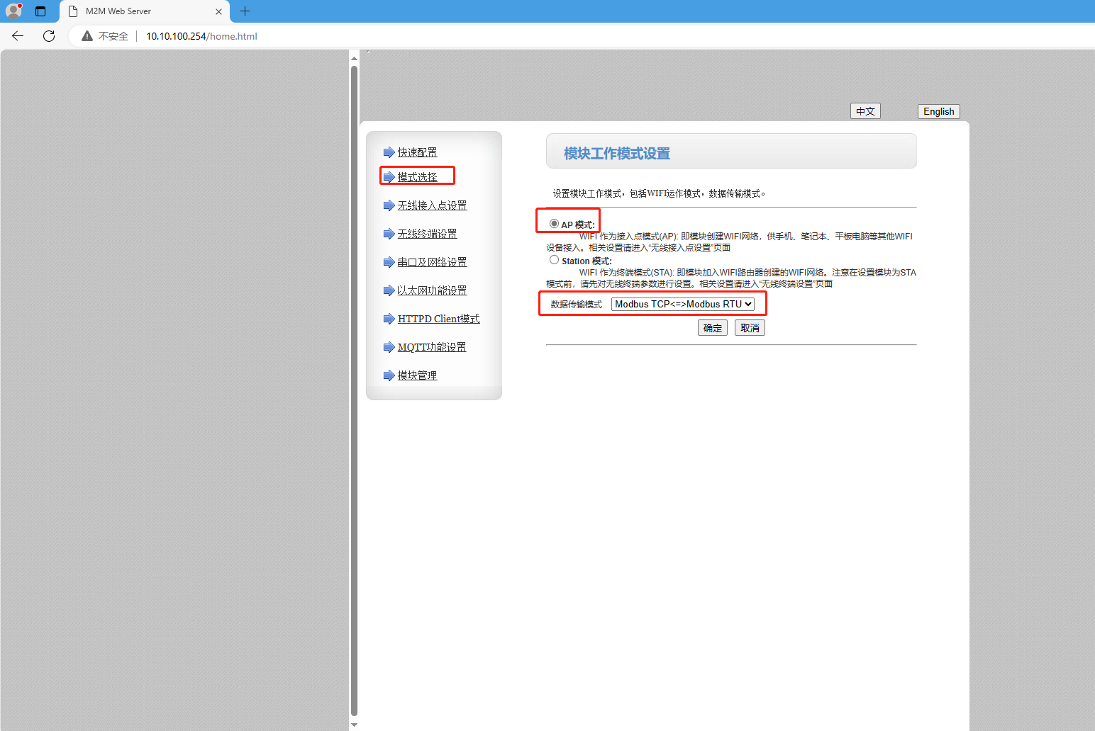 網(wǎng)頁(yè)上設(shè)置AP模式,開(kāi)啟MODBUS TCP轉(zhuǎn)MODBUS RTU模式,點(diǎn)擊確定。