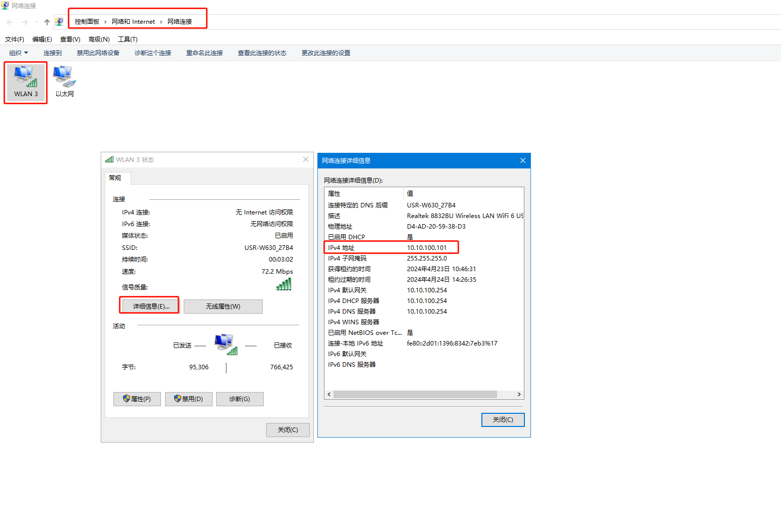 電腦連接USR-W630的WiFi之后,查看電腦本地網(wǎng)卡IP是10.10.100.101