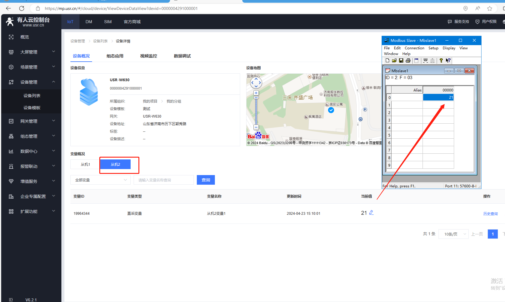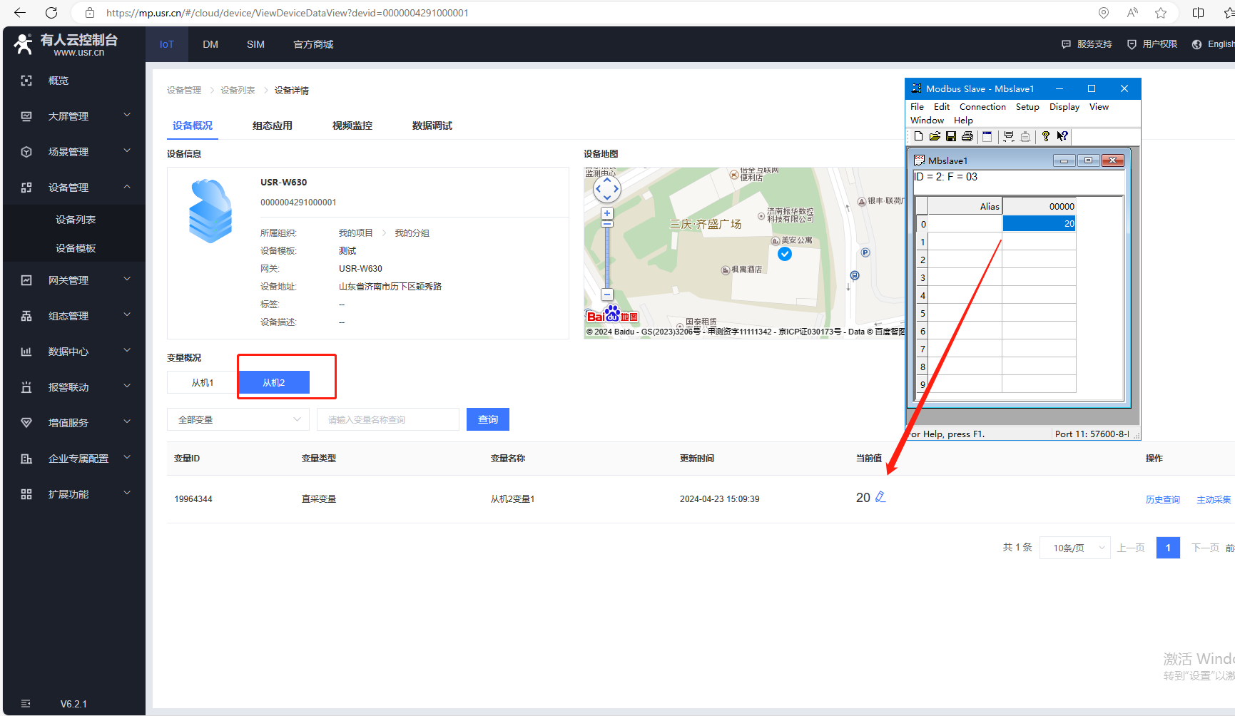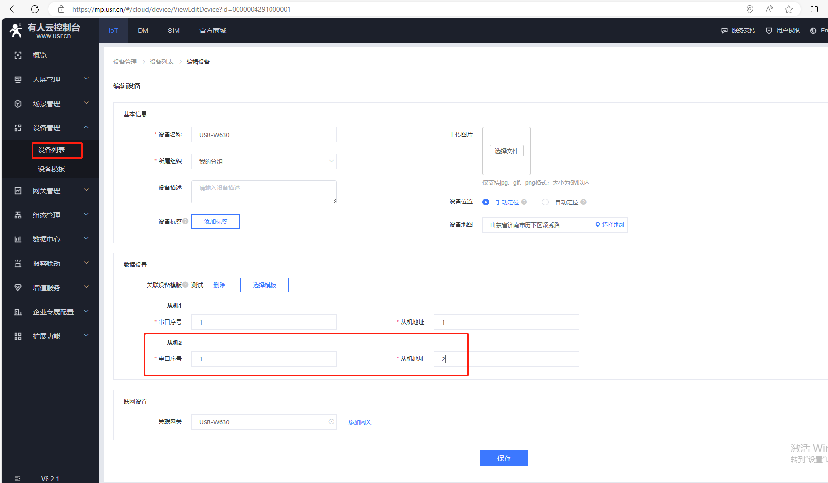 (3)點擊設(shè)備列表,點擊編輯,從機2,串口序號保持默認(rèn)1,從機地址填2,點擊保存。