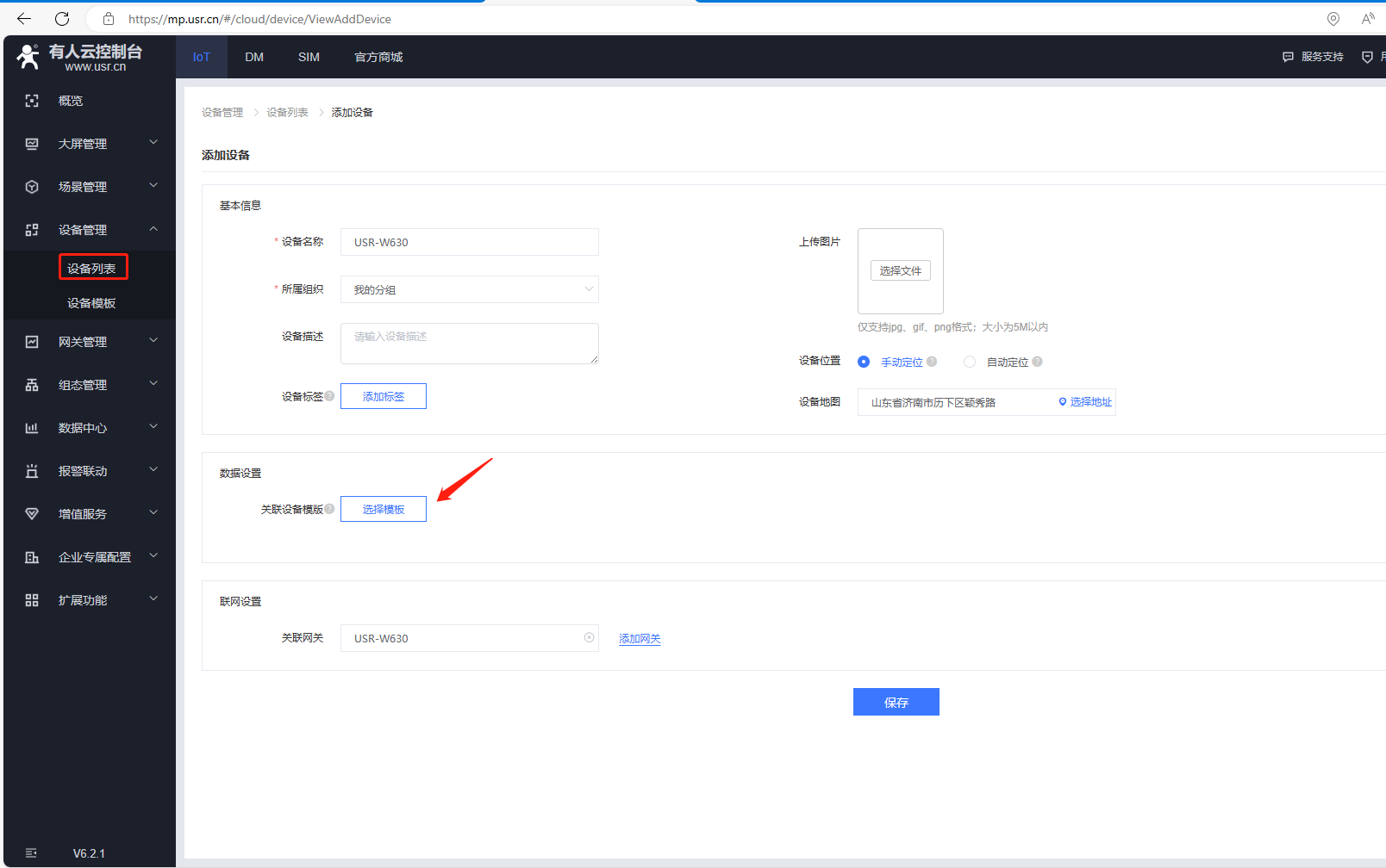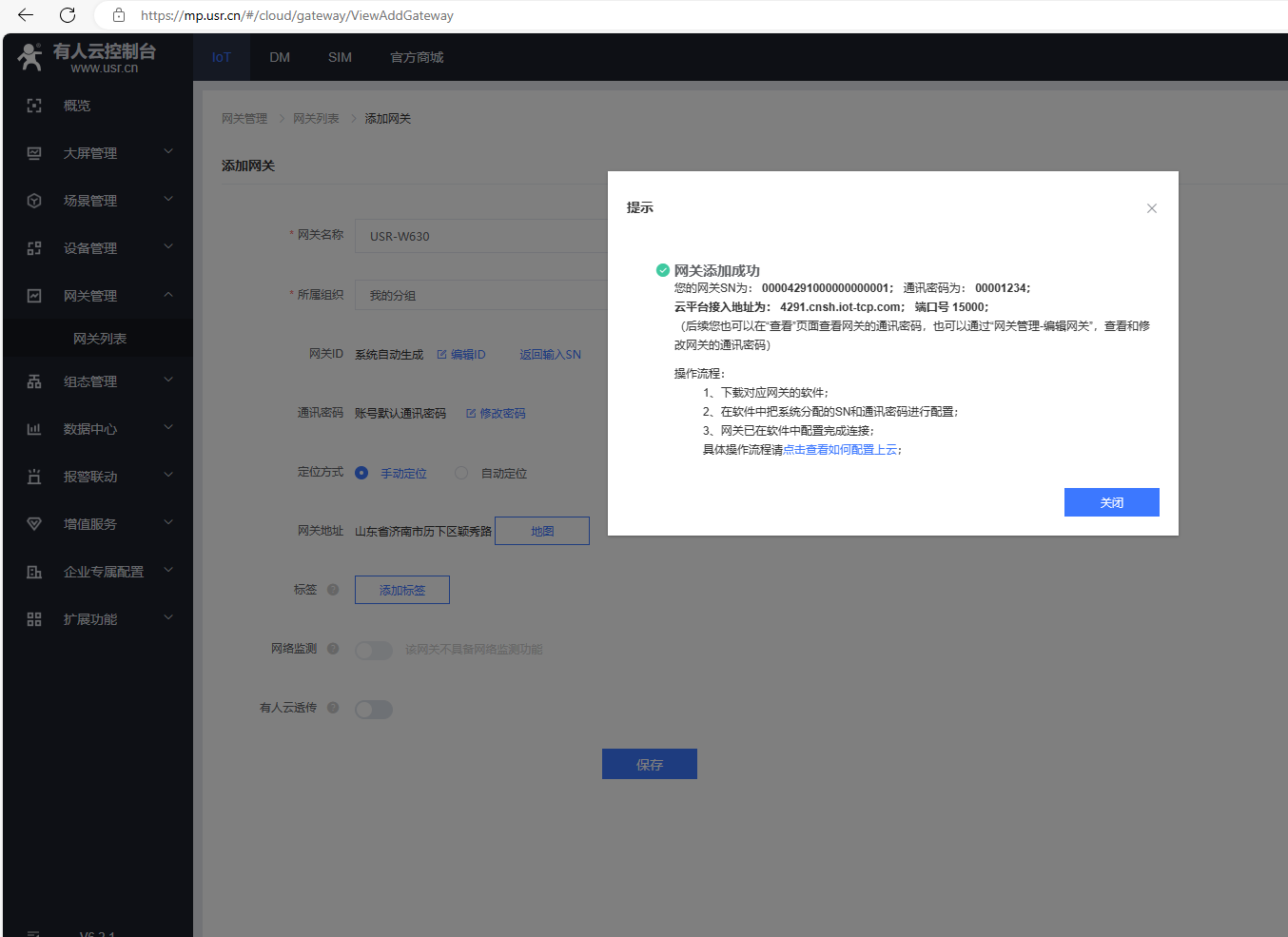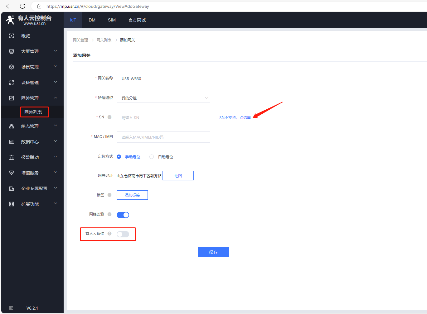 (2)W630添加有人云,點擊SN不支持點這里,有人云透傳功能需要關(guān)閉,點擊保存。