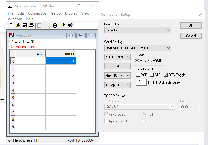 (1)第一個MODBUS SLAVE打開COM10,點擊Setup,Slave ID從機地址用1,F(xiàn)unction功能碼用03,Address寄存器起始地址用0,Quantity寄存器地址數(shù)量用1。