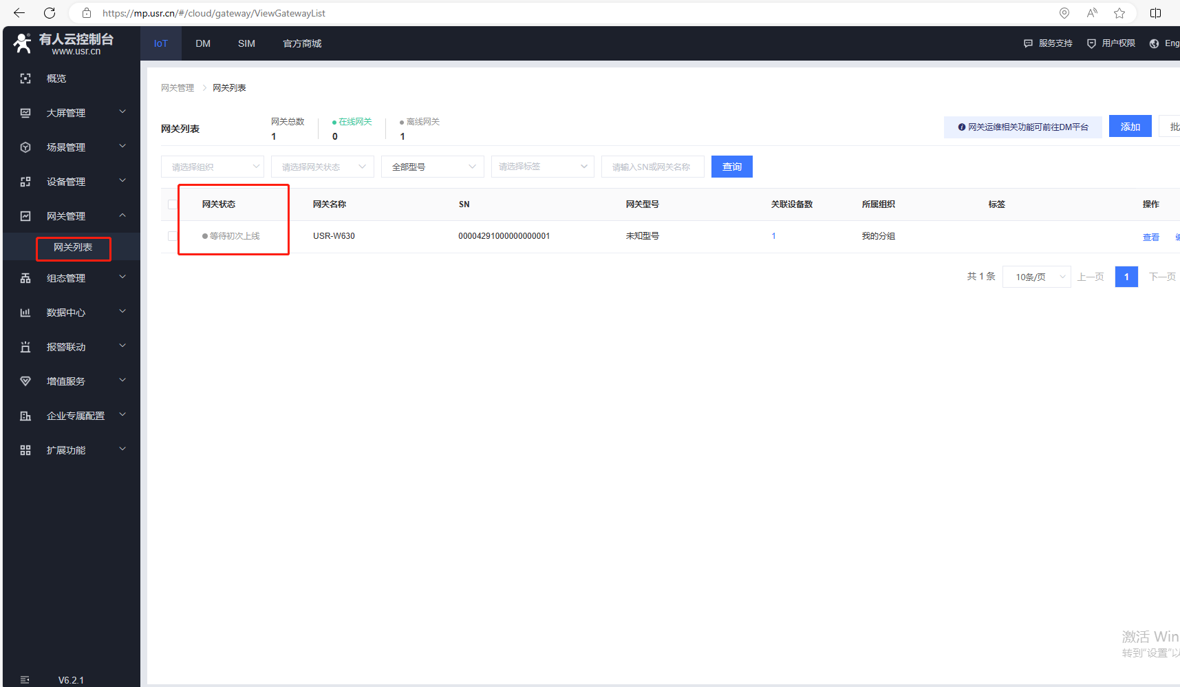 (3)網(wǎng)關(guān)狀態(tài),等待初次上線。