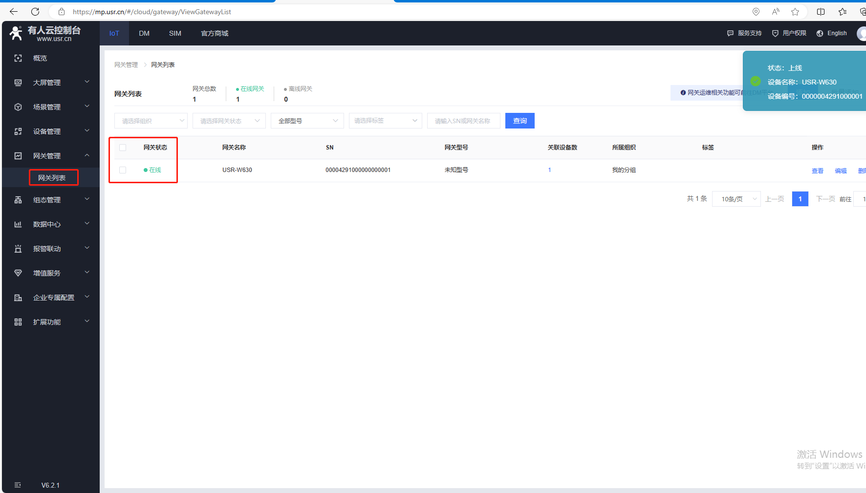 W630 STA模式連接可以聯(lián)外網(wǎng)的路由器,可以登陸有人云,看到網(wǎng)關(guān)列表、設(shè)備列表中,W630產(chǎn)品網(wǎng)關(guān)狀態(tài)是在線。