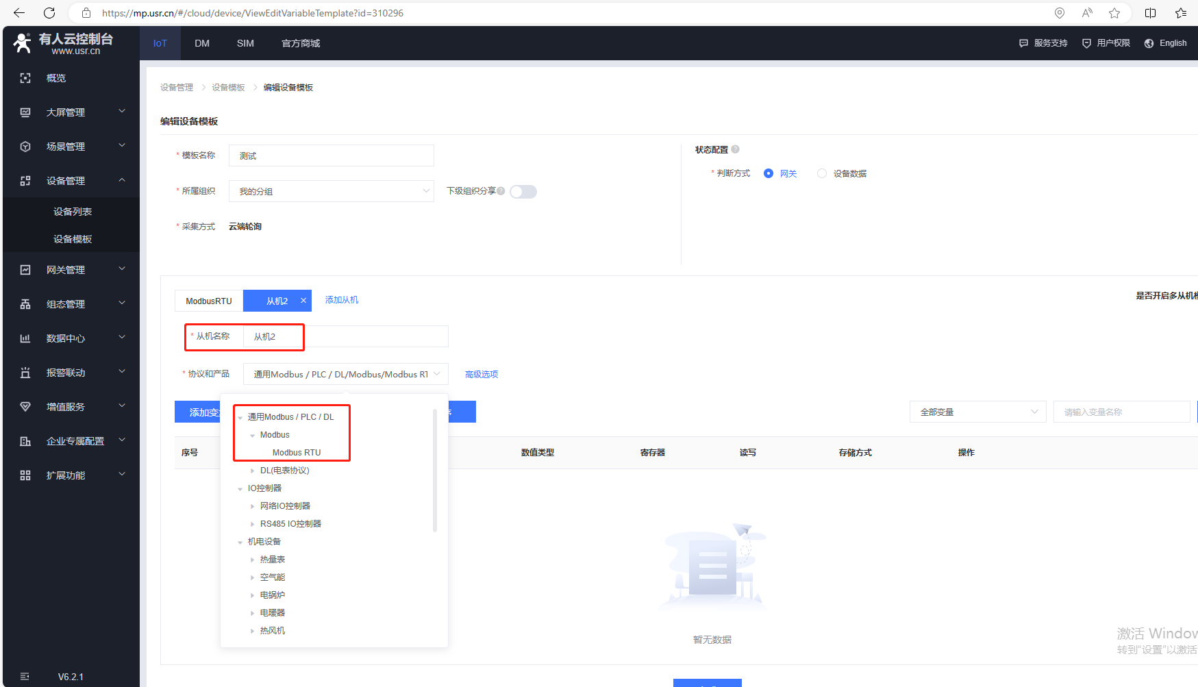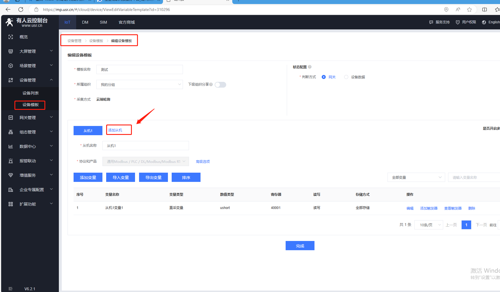 (1)點擊設(shè)備模板,點擊編輯,打開是否開啟多從機模式。
