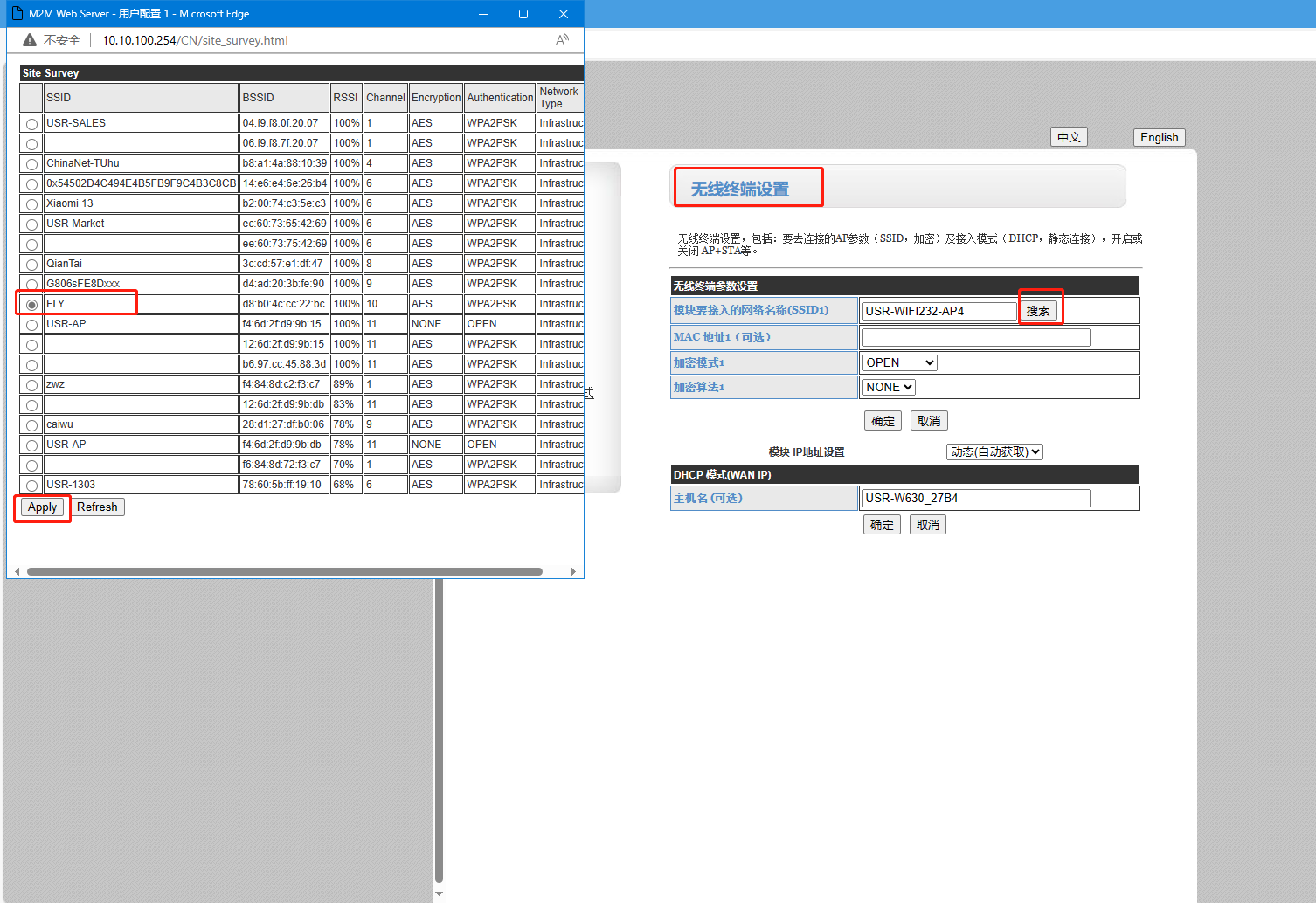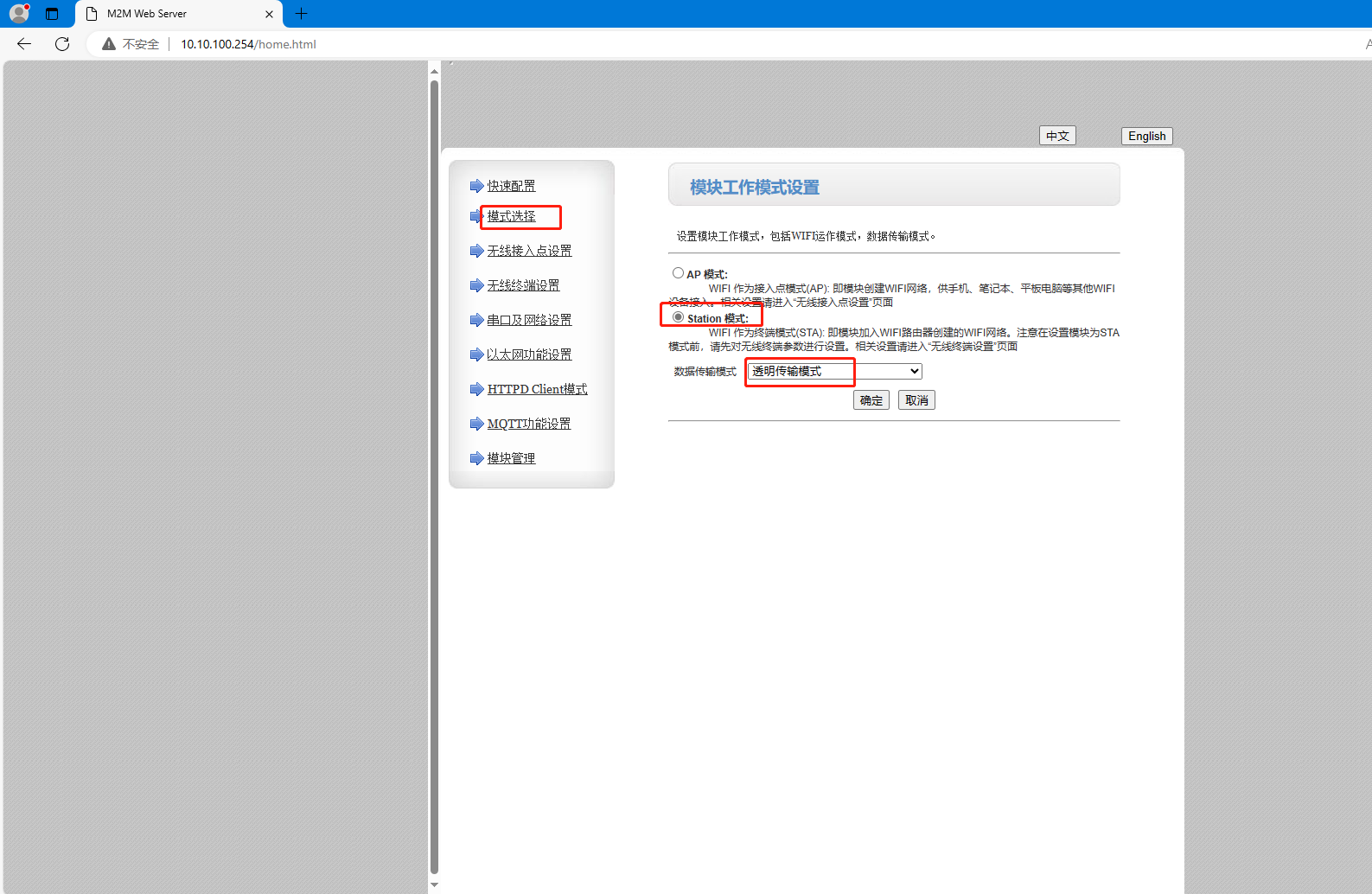 電腦連接W630的WiFi,瀏覽器輸入10.10.100.254登陸W630網(wǎng)頁,將工作模式設(shè)置STA,透明傳輸模式,點擊確定。