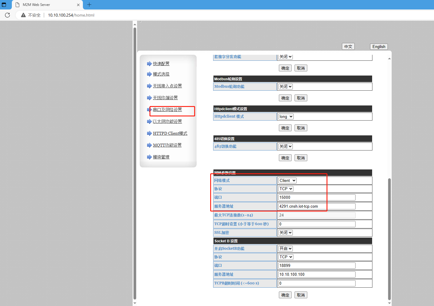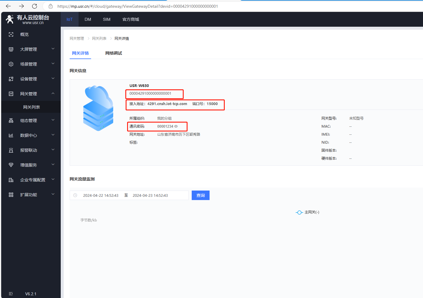 云平臺接入地址為: 4291.cnsh.iot-tcp.com; 端口號: 15000;