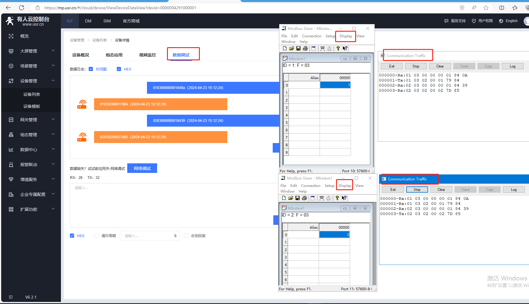 USR-W630的485串口接2個從機有人云云端輪詢示例
