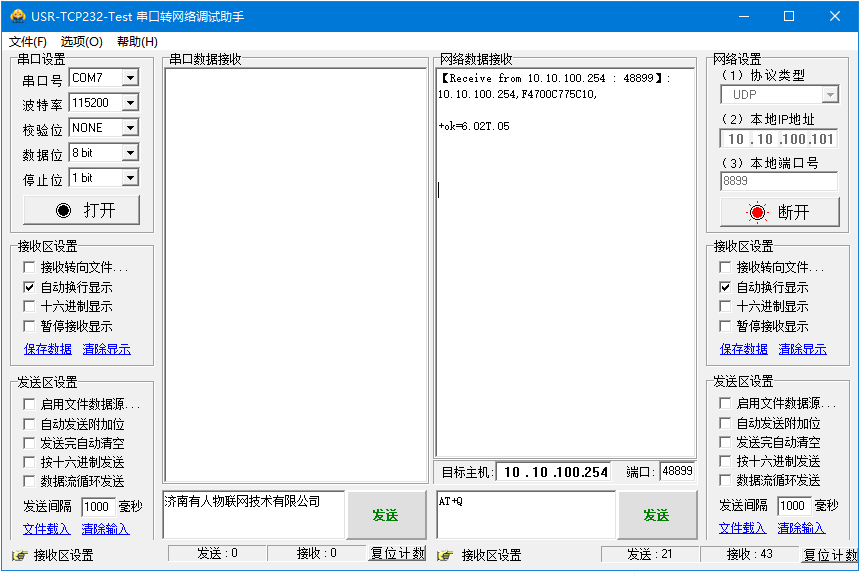 網(wǎng)絡(luò)數(shù)據(jù)接收到USR--WIFI232-A2的IP和MAC,收到IP和MAC后,立刻發(fā)送+ok(不帶回車發(fā)送),發(fā)送完就是進(jìn)入網(wǎng)絡(luò)AT指令,可以發(fā)送USR--WIFI232-A2的AT指令,去查詢參數(shù)。