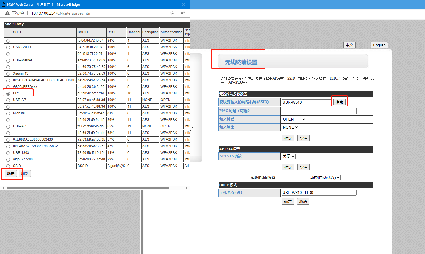 電腦連接W610的WiFi,瀏覽器輸入10.10.100.254登陸W610網(wǎng)頁,將工作模式設(shè)置STA,透明傳輸模式,點(diǎn)擊確定。