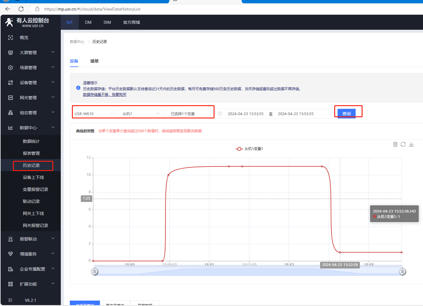 點(diǎn)開數(shù)據(jù)中心,點(diǎn)擊歷史記錄,可以查看有人云采集變量的歷史記錄。