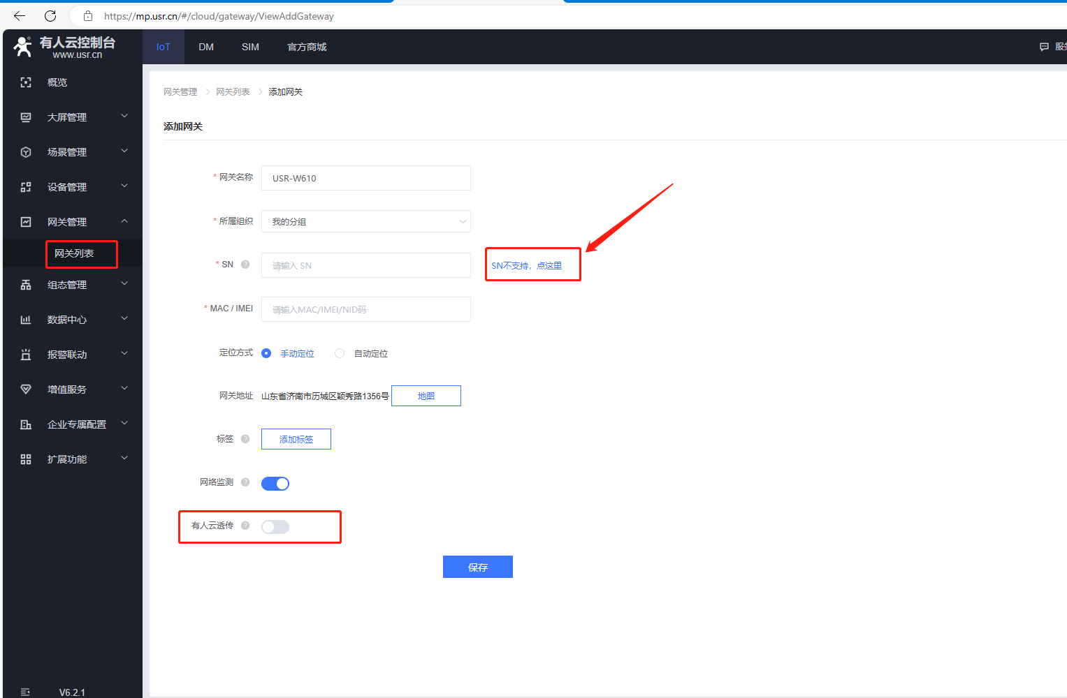 (2)W610添加有人云,點(diǎn)擊SN不支持點(diǎn)這里,有人云透傳功能需要關(guān)閉,點(diǎn)擊保存。
