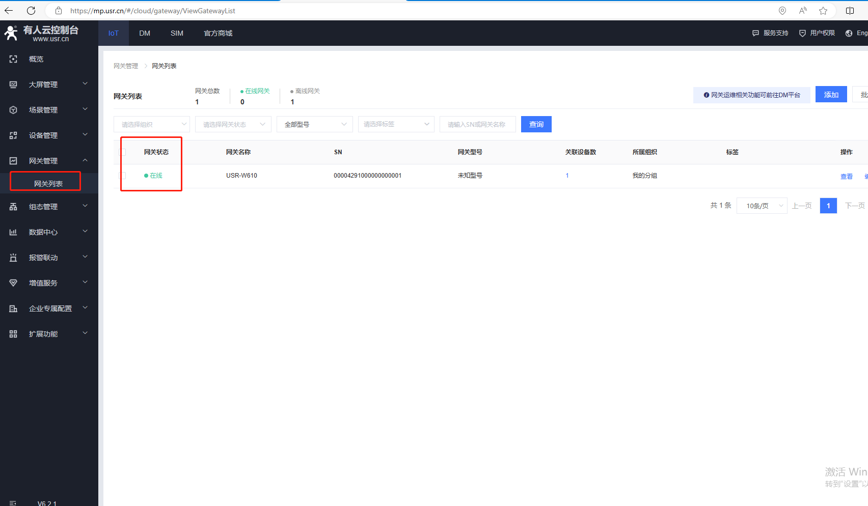 W610 STA模式連接可以聯(lián)外網(wǎng)的路由器,可以登陸有人云,看到網(wǎng)關(guān)列表、設(shè)備列表中,W610產(chǎn)品網(wǎng)關(guān)狀態(tài)是在線。