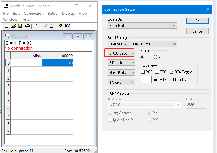 MODBUS SLAVE打開COM10,點(diǎn)擊Setup,Slave ID從機(jī)地址用1,F(xiàn)unction功能碼用03,Address寄存器起始地址用0,Quantity寄存器地址數(shù)量用1。