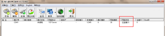 如使用一個(gè)GPRS DTU建立連接時(shí)會(huì)在網(wǎng)絡(luò)狀態(tài)上顯示已連接(1)。網(wǎng)絡(luò)狀態(tài)如果一直顯示監(jiān)聽(tīng)狀態(tài),請(qǐng)檢查之前設(shè)置參數(shù)是否有誤,
