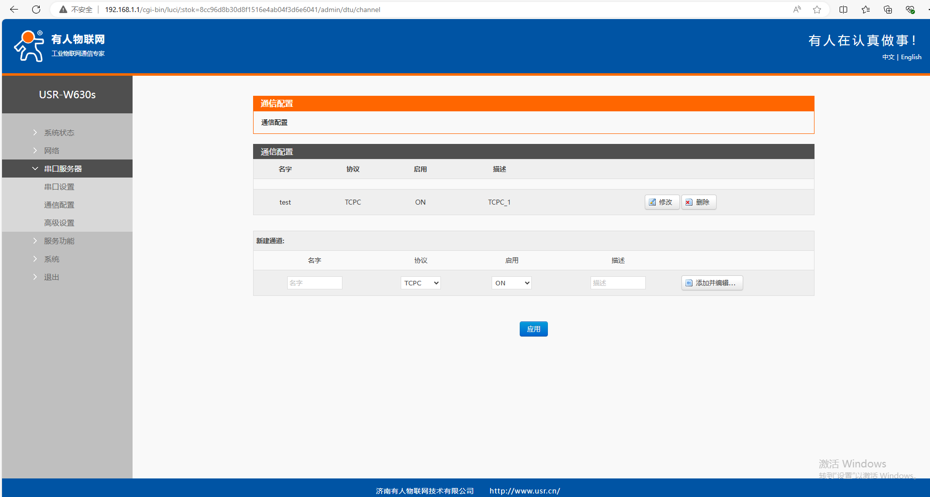 (2)跳轉(zhuǎn)到TCPC-通信配置頁面,服務(wù)器地址填電腦IP 192.168.1.167,服務(wù)器端口填8899,傳輸模式選擇Pass-Through,通道綁定選擇COM2-232。點(diǎn)擊應(yīng)用。