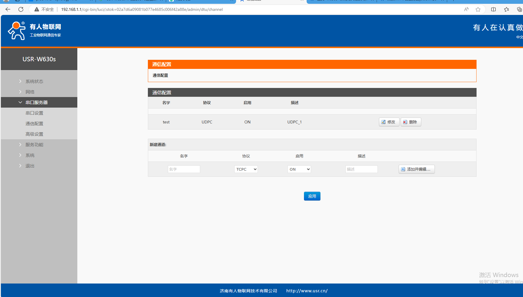 注意:實(shí)際應(yīng)用,根據(jù)USR-W630s實(shí)際使用的串口,修改串口參數(shù),和所接串口設(shè)備的串口參數(shù)保持一致。如果修改參數(shù),需要點(diǎn)擊應(yīng)用。