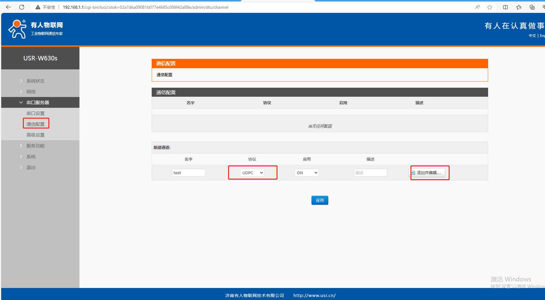(1)通信配置,新建通道,協(xié)議UDPC,啟用ON,點(diǎn)擊添加并編輯。