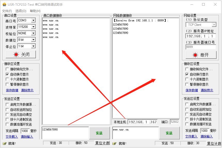 3、測試串口端向網(wǎng)絡(luò)端發(fā)送數(shù)據(jù),網(wǎng)絡(luò)端也可以向串口端發(fā)送數(shù)據(jù)。