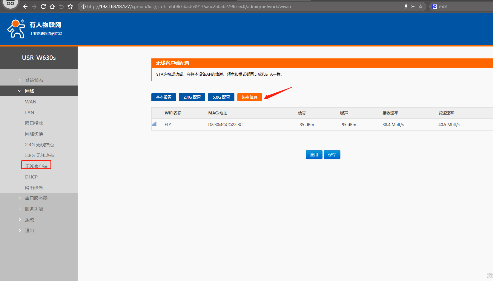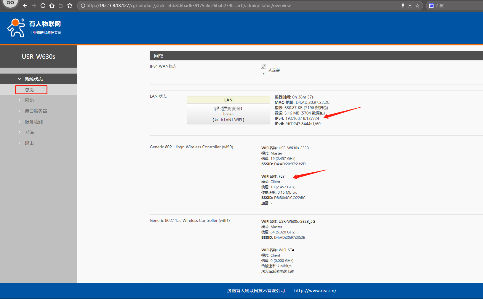(2)瀏覽器輸入U(xiǎn)SR-W630s 修改后的LAN口IP,192.168.18.127,可以點(diǎn)擊總覽查看網(wǎng)絡(luò)信息,可以點(diǎn)開無線客戶端,熱點(diǎn)信息,查看連接的路由器信息。