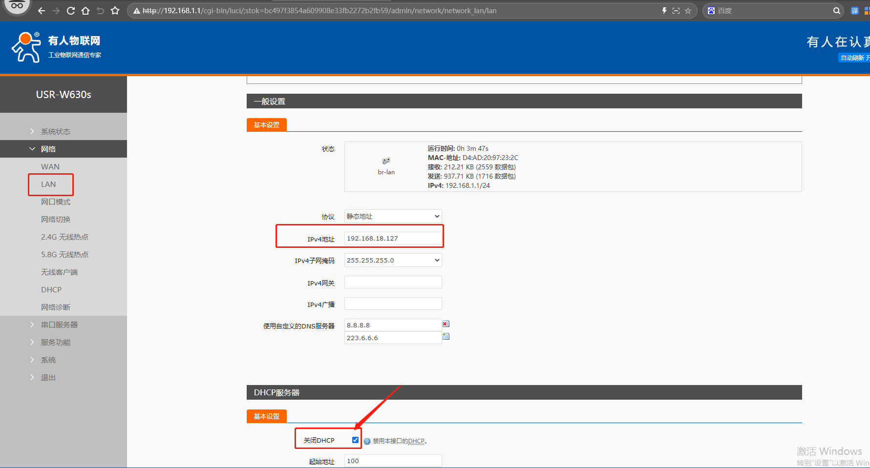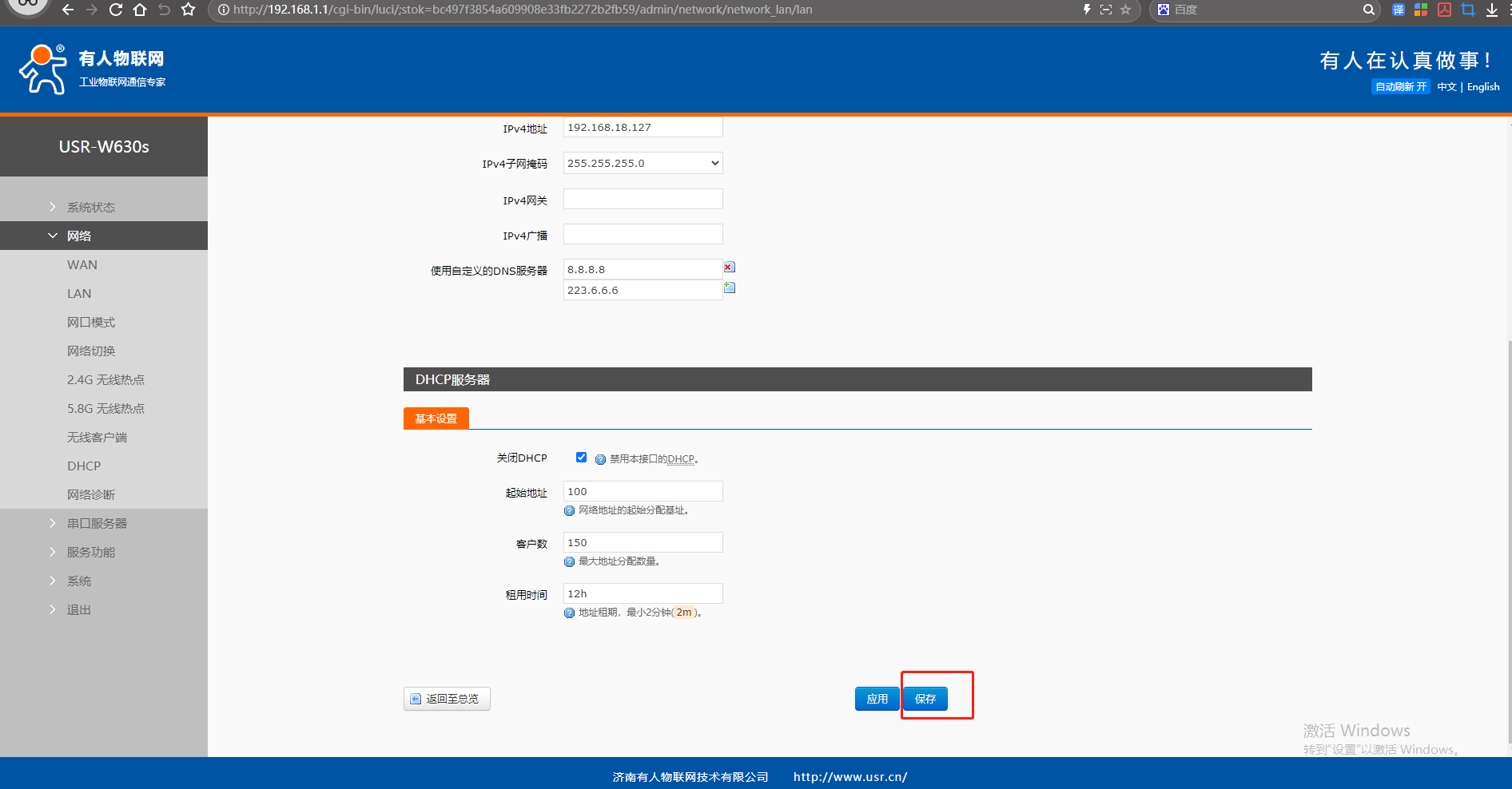 (2)點(diǎn)開網(wǎng)頁網(wǎng)絡(luò),點(diǎn)擊LAN,點(diǎn)擊修改,IPv4地址設(shè)置和USR-W630s STA連接的路由器 IP同網(wǎng)段(不重復(fù)、不沖突的IP)192.168.18.127。DHCP服務(wù)器設(shè)置,關(guān)閉DHCP功能。點(diǎn)擊保存。
