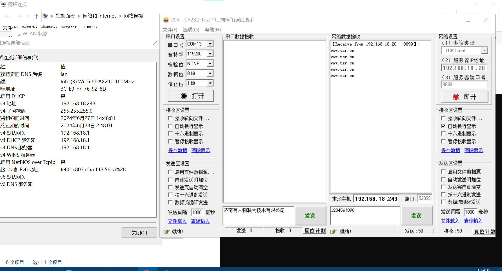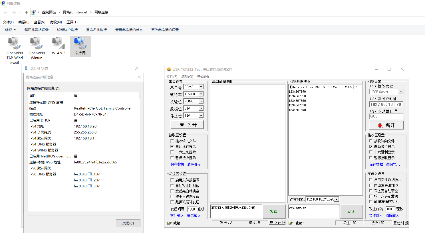 (1)第一臺(tái)電腦用網(wǎng)線連接USR-W630s的LAN口,電腦設(shè)置和USR-W630s STA連接的路由器同網(wǎng)段IP,案例設(shè)置的是192.168.18.20。