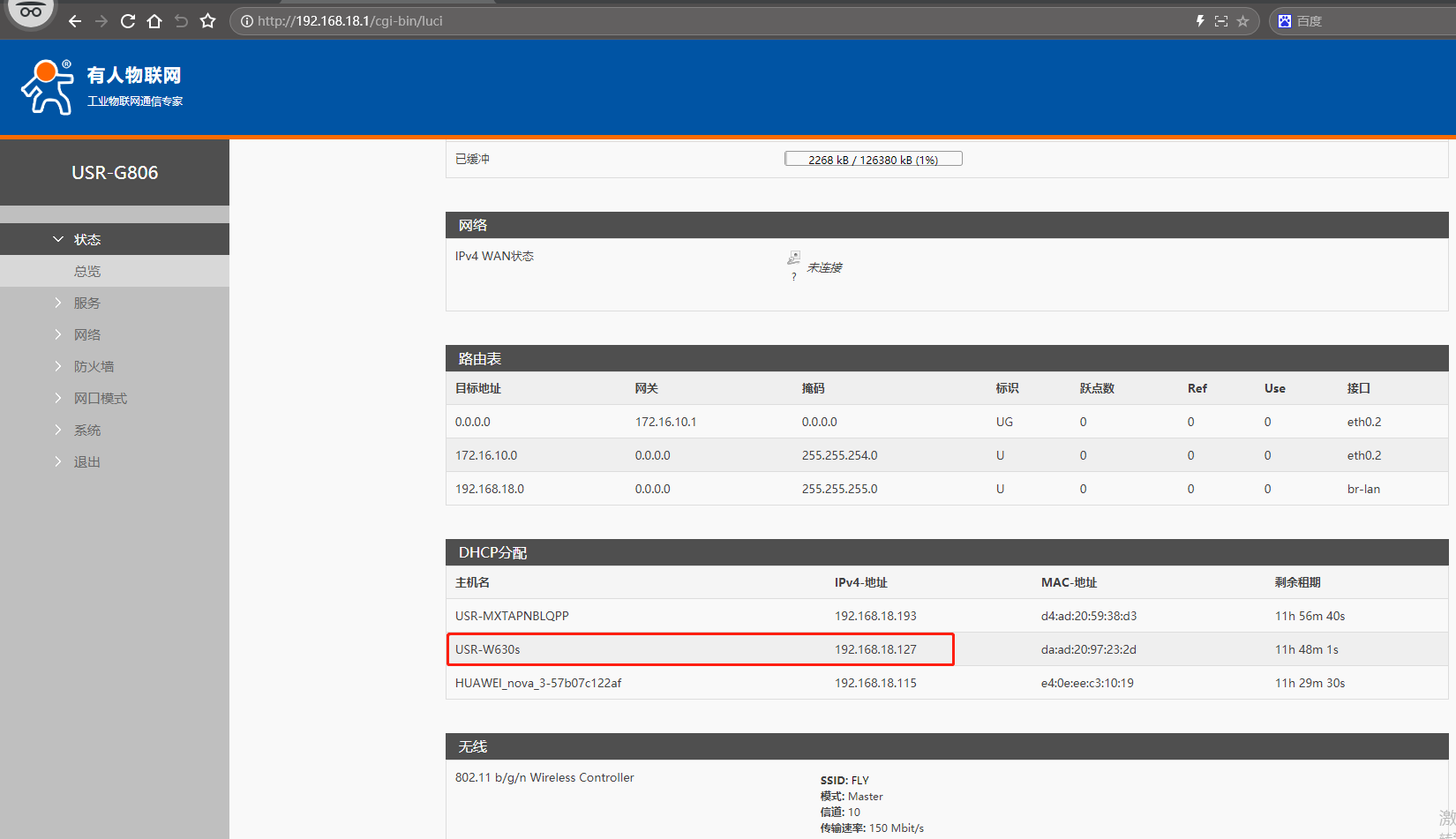 (1)USR-W630s 單獨(dú)設(shè)置STA模式連接路由器,可以登陸路由器網(wǎng)頁查看路由器分配給USR-W630s的IP,再設(shè)置橋接模式的時(shí)候,可以將這IP 192.168.18.127固定給USR-W630s。