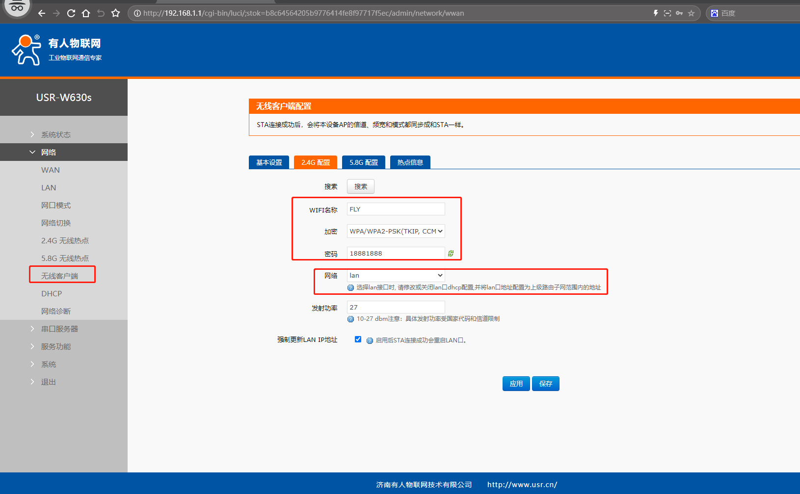 (2)點(diǎn)開網(wǎng)頁2.4G配置,填入STA模式要連接的路由器WiFi名稱FLY,填入路由器密碼,網(wǎng)絡(luò)選擇lan。注意選擇lan接口時(shí),請(qǐng)修改或關(guān)閉lan口dhcp配置,并將lan口地址配置為上級(jí)路由子網(wǎng)范圍內(nèi)的地址。點(diǎn)擊保存。