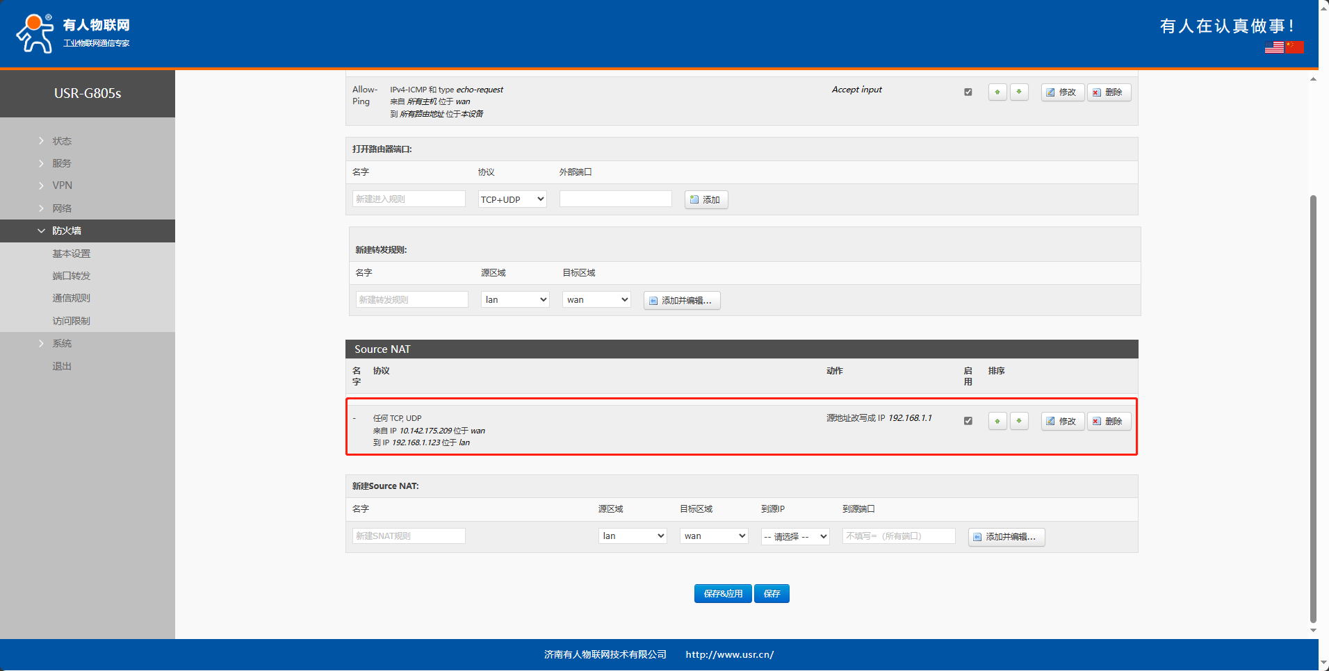 跳轉(zhuǎn)到如下界面,協(xié)議按照需要設置,源IP填G805s的4G(專網(wǎng)) IP,目標IP地址填寫lan口所連設備的IP,點擊保存&應用。
