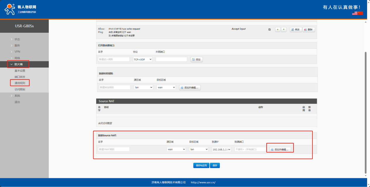 2、在防火墻--通訊規(guī)則,新建Source NAT,名稱自定義,原區(qū)域選擇wan,目標區(qū)域選擇lan,到源IP選擇G805s的lan口IP,點擊添加并編輯。