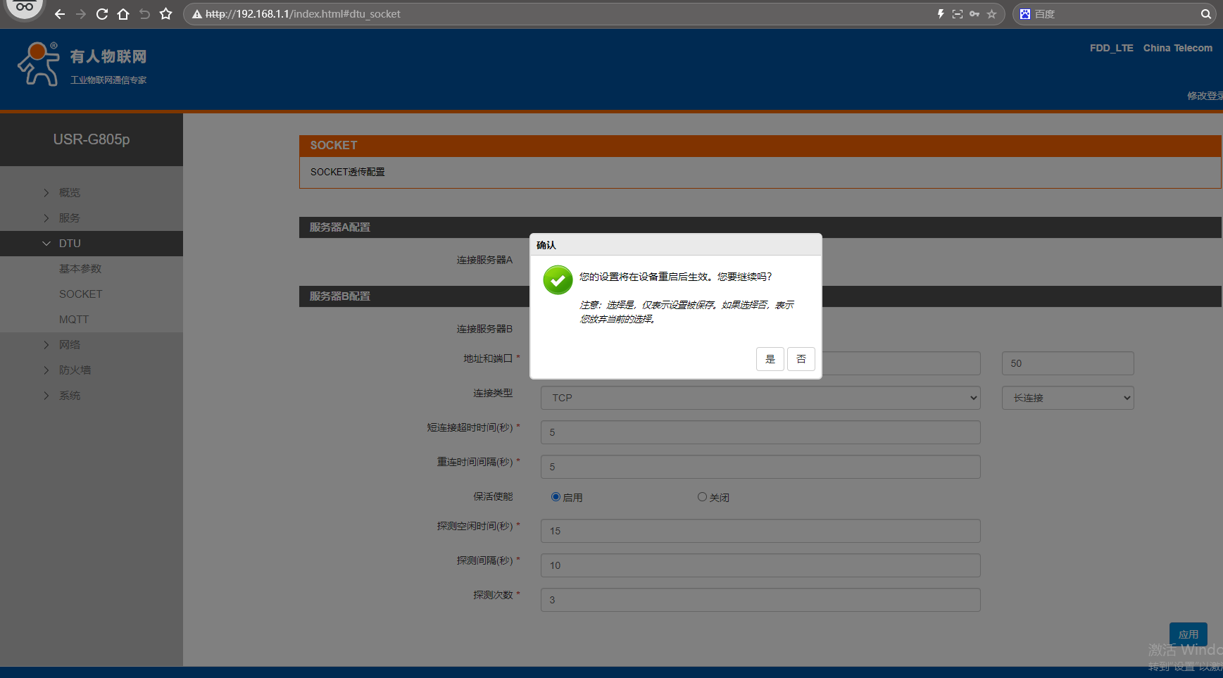 網(wǎng)頁點擊DTU,點擊SOCKET,連接服務器B,點擊啟用,地址填遠程服務器,端口號50,連接類型TCP,長連接。點擊應用。