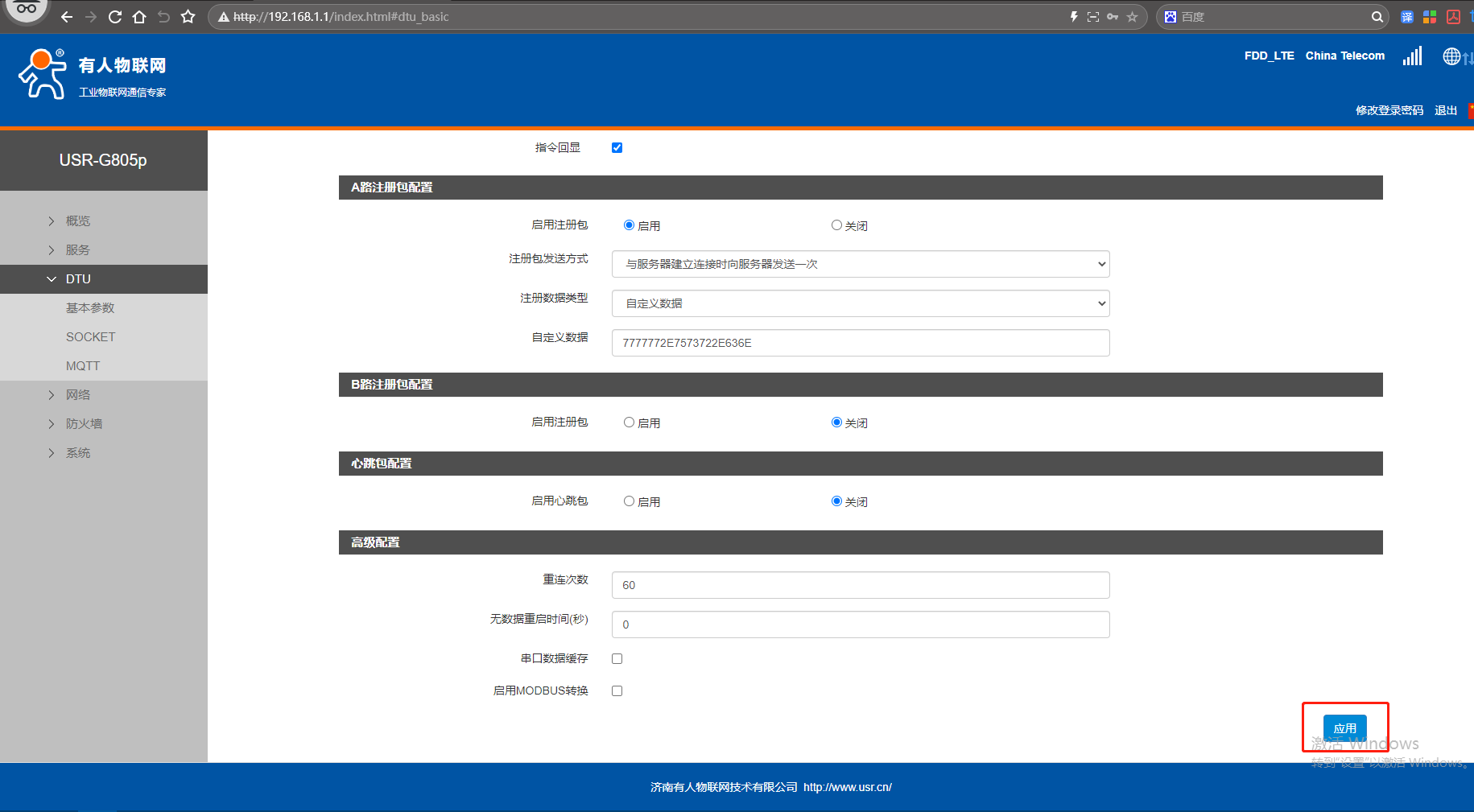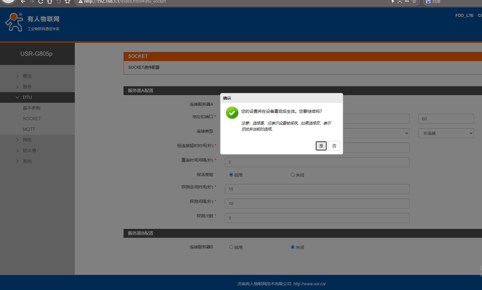 網(wǎng)頁點擊DTU,點擊SOCKET,連接服務(wù)器A,點擊啟用,地址填遠(yuǎn)程服務(wù)器,端口號60,連接類型TCP,長連接。點擊應(yīng)用。