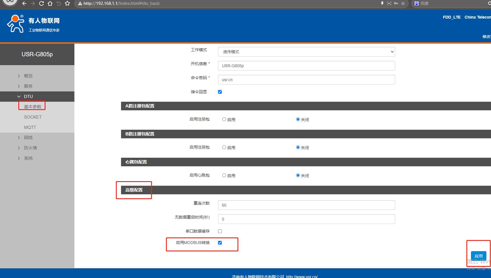 網(wǎng)頁點(diǎn)擊DTU,點(diǎn)擊基本參數(shù),工作模式選擇透傳模式,最下面高級配置,啟用MODBUS轉(zhuǎn)換勾選。最后點(diǎn)擊應(yīng)用。