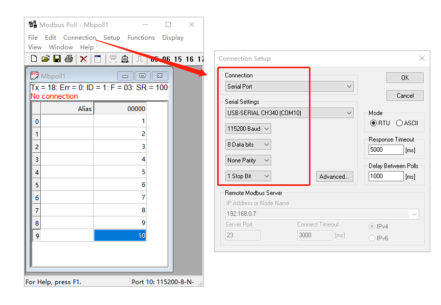 4、Modbus Poll軟件,點(diǎn)擊Connection,選擇Serial Port,選擇對應(yīng)的COM口COM10,對應(yīng)USR-G805p的串口參數(shù),最后點(diǎn)擊OK。